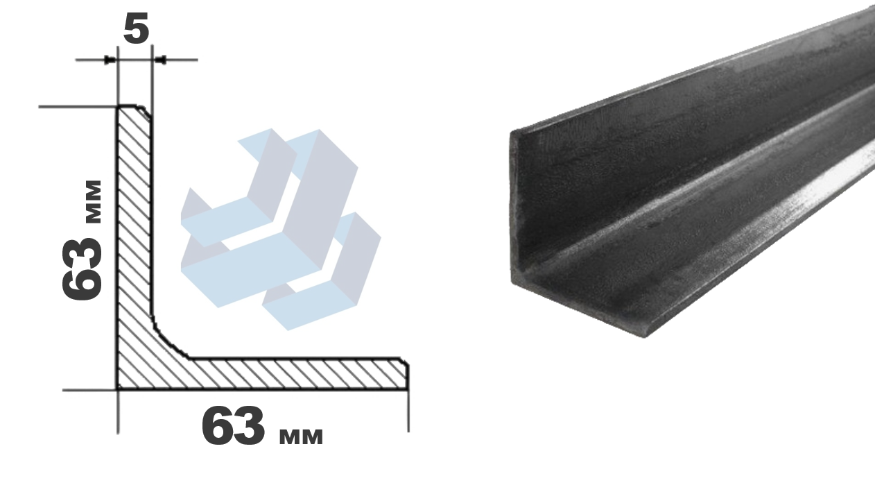 Уголок равнополочный горячекатаный по ГОСТ 8509-93 изготовлен из конструкционной стали марки Ст3пс/сп. Размеры полки — 63×5 мм, стандартная длина — 6000 мм. Данный профиль отличается высокой прочностью, устойчивостью к деформациям и коррозии, что делает его востребованным в строительстве, машиностроении и других отраслях.